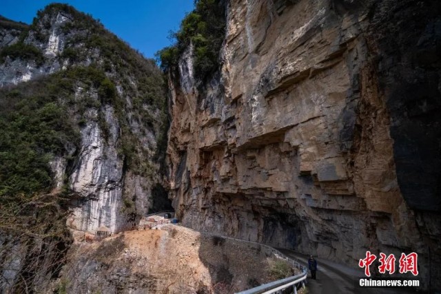 下庄村公路旁的崖壁上清晰可见当年修路凿过的痕迹。中新网 何蓬磊 摄(2021年3月9日)