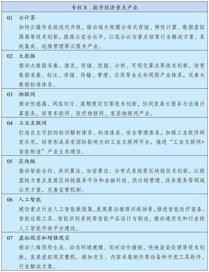 培育壮大人工智能、大数据、区块链、云计算、网络安全等新兴数字产业,提升通信设备、核心电子元器件、关键软件等产业水平。构建基于5G的应用场景和产业生态,在智能交通、智慧物流、智慧能源、智慧医疗等重点领域开展试点示范。鼓励企业开放搜索、电商、社交等数据,发展第三方大数据服务产业。促进共享经济、平台经济健康发展。