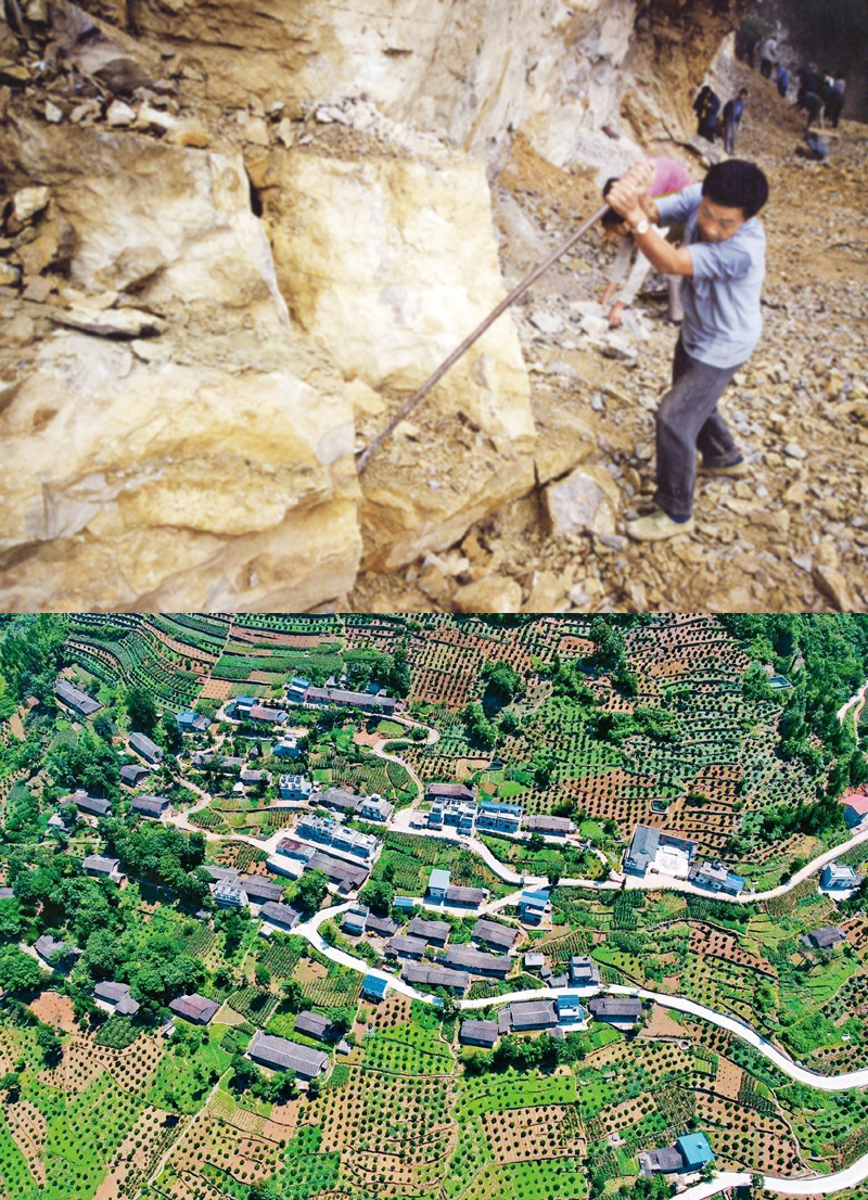 △上图为1999年9月,毛相林用钢钎撬大石,带领村民一寸寸凿开出山公路。下图为下庄村新貌。