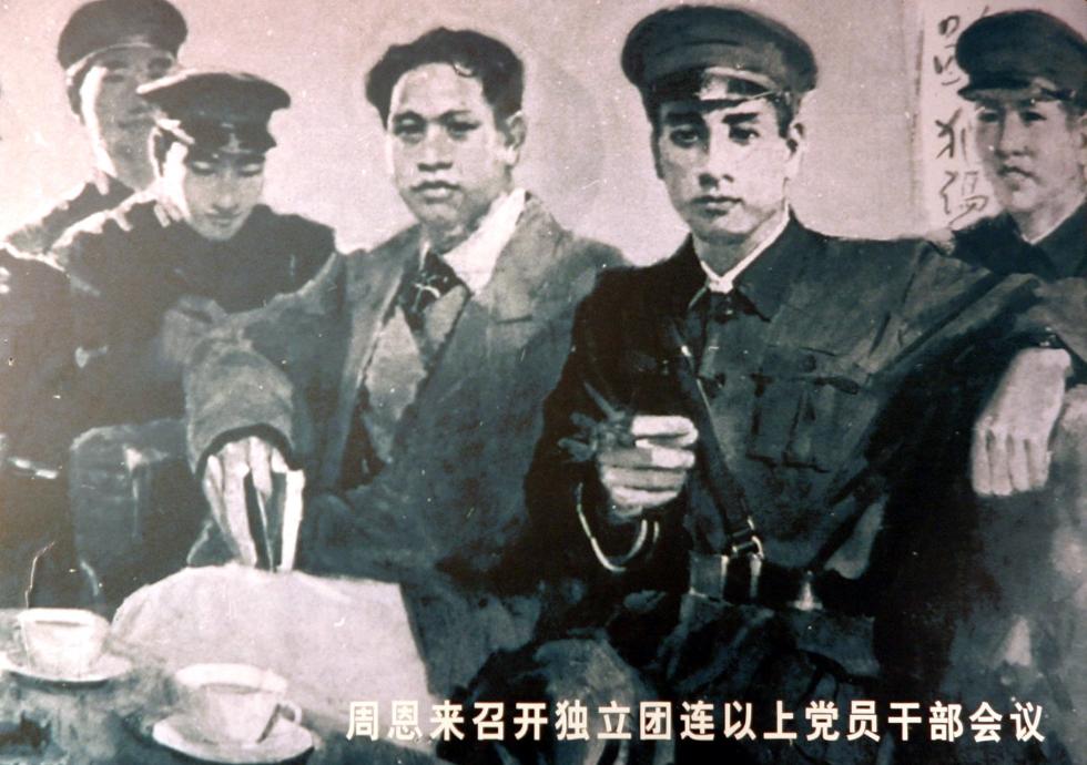 △图为绘画记录周恩来召开独立团连以上党员干部会议。(1926年5月1日,叶挺率领独立团由肇庆、新会出发,在广州集结。周恩来代表中共广东区委,在广州叶家祠召集独立团连以上干部会议,做出重要指示,“要起先锋作用、模范作用、骨干作用;你们的任务很重要,一定要打胜仗”,最后用“饮马长江”激励独立团将士。)