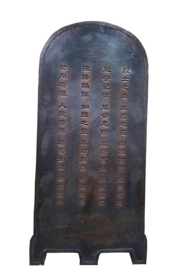 △图为“铁军”盾牌,盾牌高1米,宽0.5米,重达数十斤,正面铸着“铁军”两个大字,用红漆漆过。铁盾牌的上款铸有“国民革命军第四军全体同志伟鉴”,下款是“民国十六年一月十五日武汉粤侨联谊社同人敬赠”。背面铸有四言体词一首: