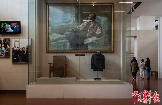 2021年3月23日,中国国家博物馆《复兴之路》主题展的基本陈列中,关于邓小平南巡的油画、物品等。油画作品《小平南巡》创作于2003年,画面中,小平同志坐在南下的列车上,望向窗外,阳光映照在他的脸上。中青报·中青网记者 李峥苨/摄