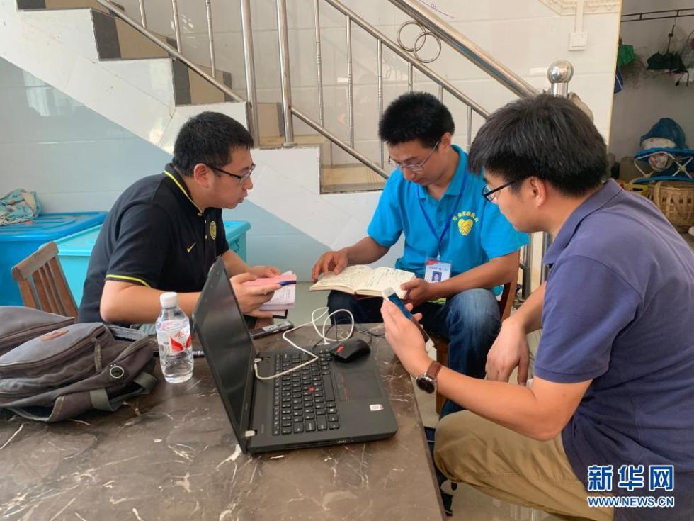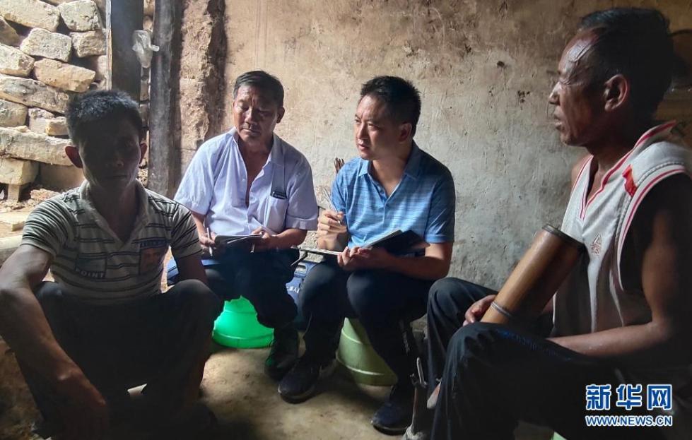 记者何伟(右一)与同事采访广西百色市乐业县百坭村新任驻村第一书记杨杰兴(中)(2019年7月31日摄)。新华社记者 徐海涛 摄