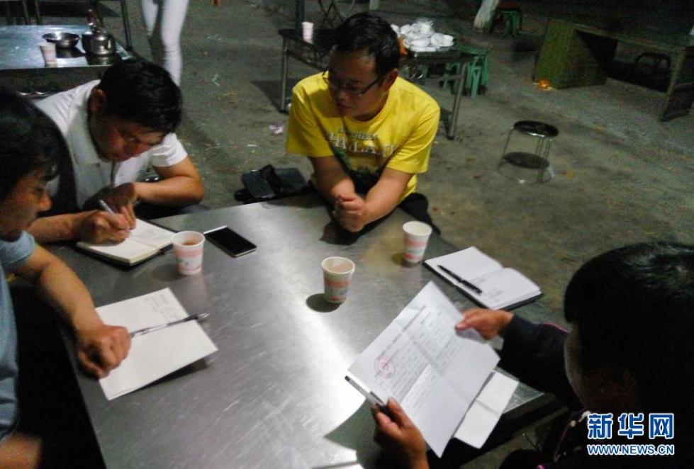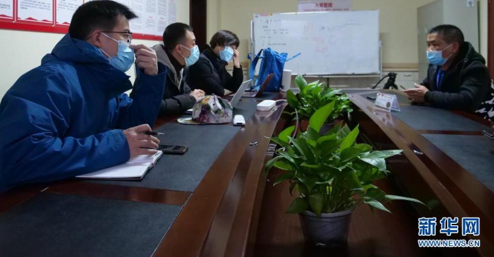 新华社记者杨静(左二)、陈欣波(左三)、孙敏(右一)在吴志宏生前工作的云南红河州史志办采访他的同事(2月2日摄)。新华社发(李艾蓉 摄)