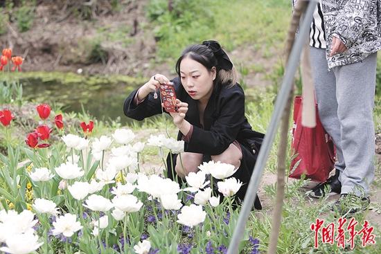 4月7日,上海市崇明区东平国家森林公园,游客在鲜花前驻足拍照。中青报·中青网记 孔斯琪/摄