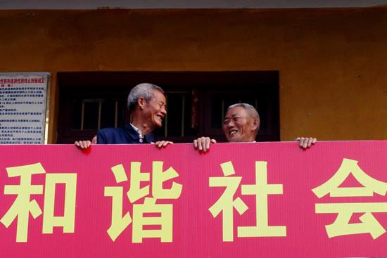 2007年10月5日,湖南邵阳,“和谐社会”横幅前,老人正在交谈。 视觉中国供图