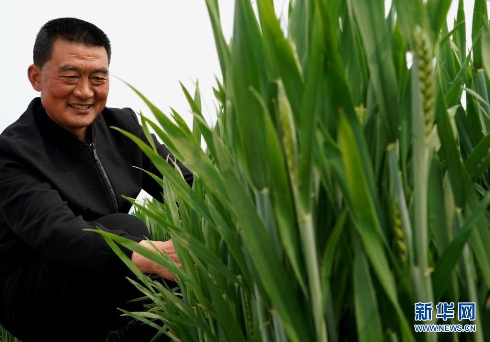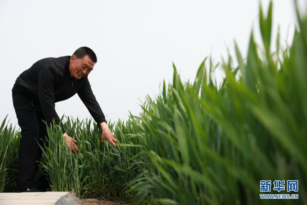 在河南省商水县南陵村一处高标准农田里,种粮大户邱守先在查看小麦生长情况(4月14日摄)。新华社记者 李安 摄