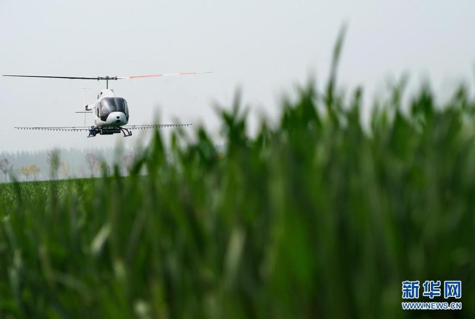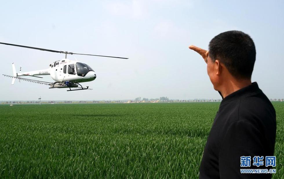 突然,随着马达轰鸣,接到赤霉病防控指令的一架直升机载着600斤稀释过后的中药化肥从地头升起,向麦田飞去。作业、悬停、转身、继续作业,直升机不疾不徐地从麦田的一头滑到另一头,在低空飞出一个个标准的“S”。仅仅10分钟后,400亩麦田全部喷洒完毕。