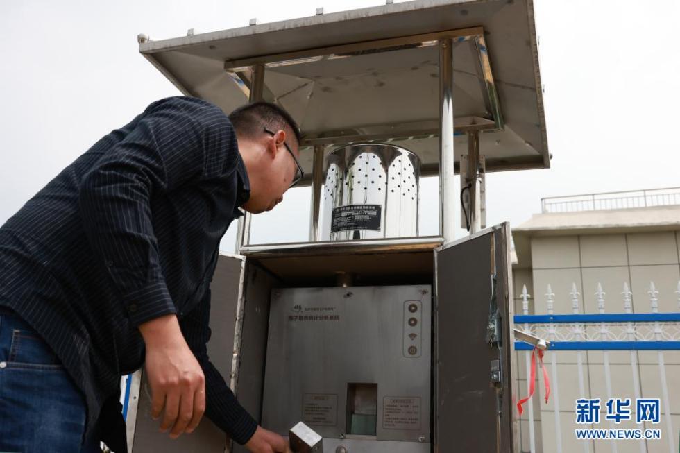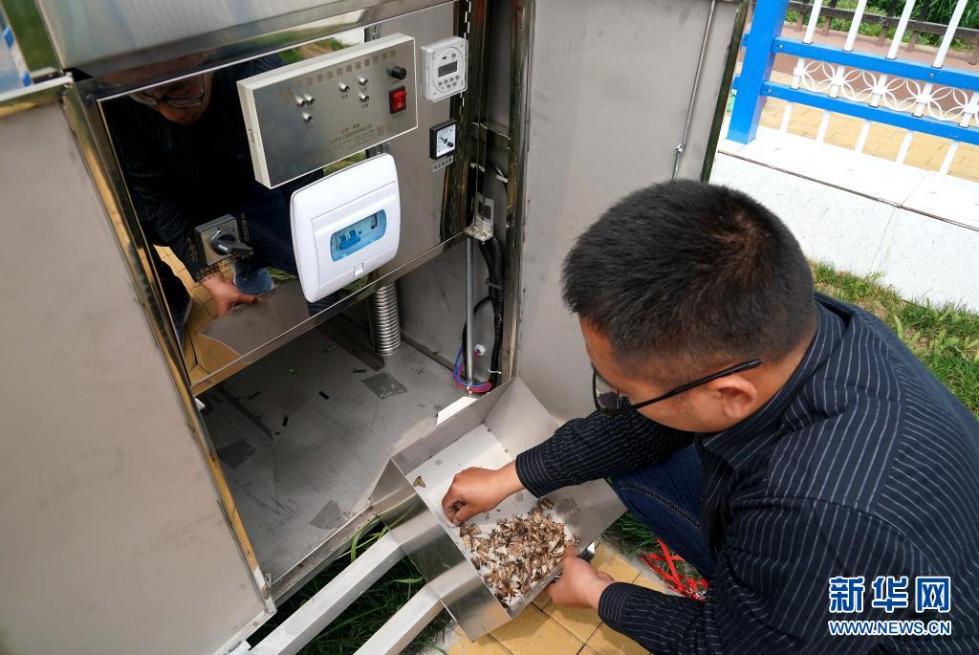 在河南省商水县南陵村一处高标准农田里,工作人员在查看高空昆虫控诱设备接虫盒里昆虫的种类和数量,了解虫情(4月14日摄)。 新华社记者 李安 摄