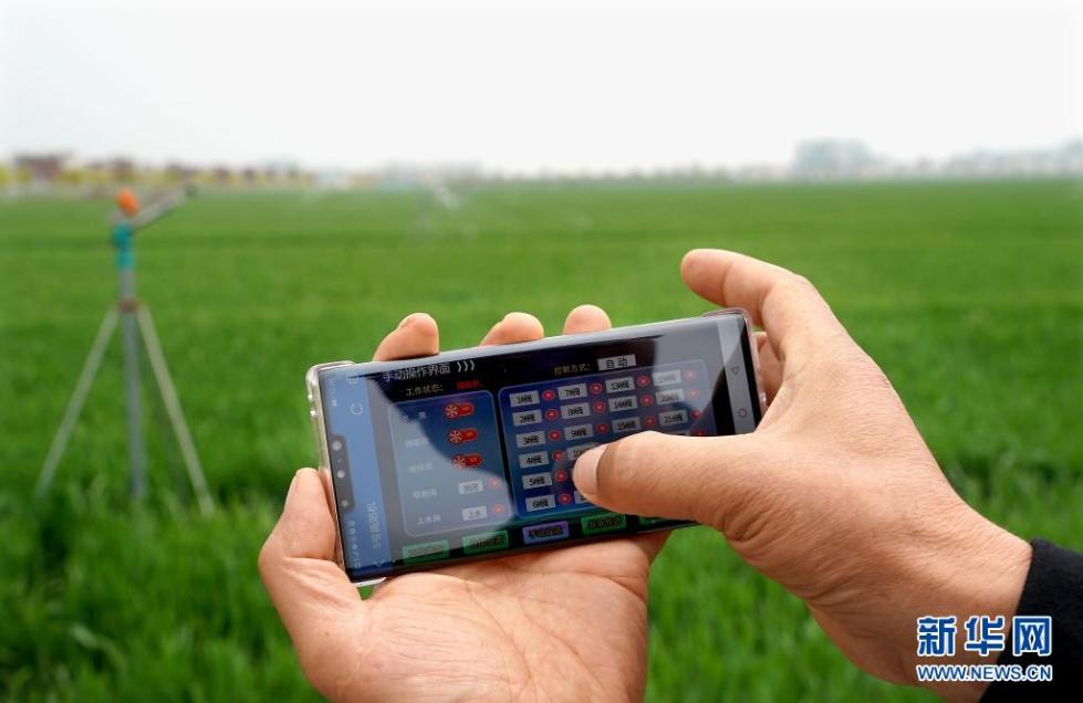 在河南省商水县南陵村一处高标准农田里,种粮大户邱守先使用手机操控设备对小麦田进行喷灌(4月14日摄)。 新华社记者 李安 摄
