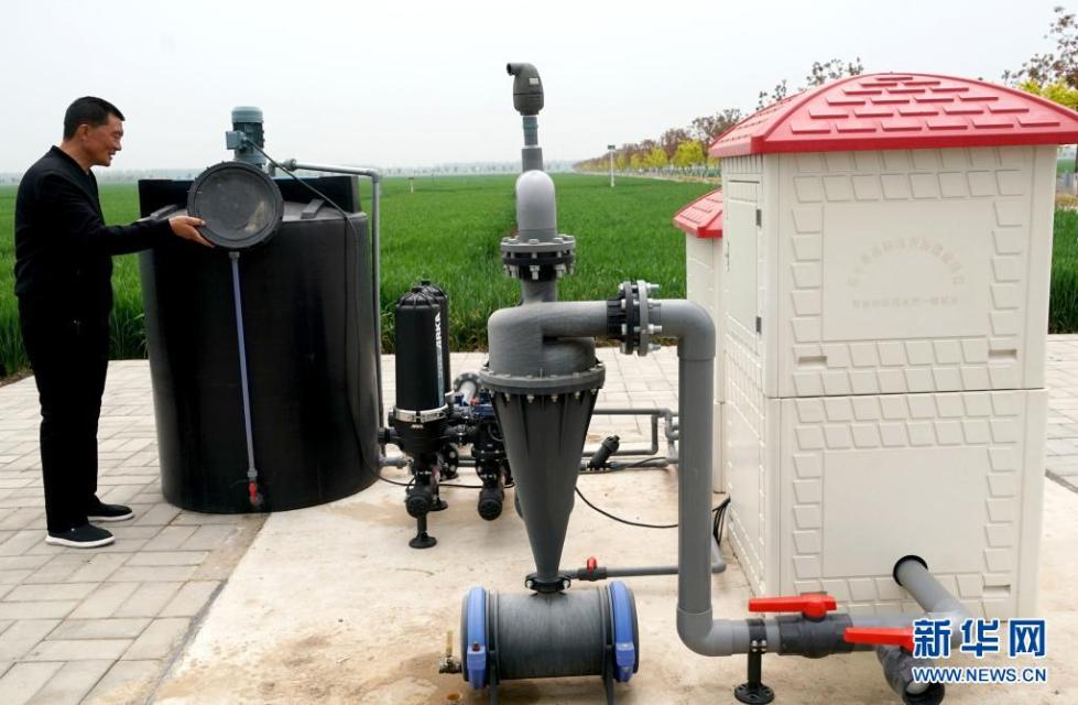 在河南省商水县南陵村一处高标准农田里,种粮大户邱守先在查看水肥一体机(4月14日摄)。 新华社记者 李安 摄