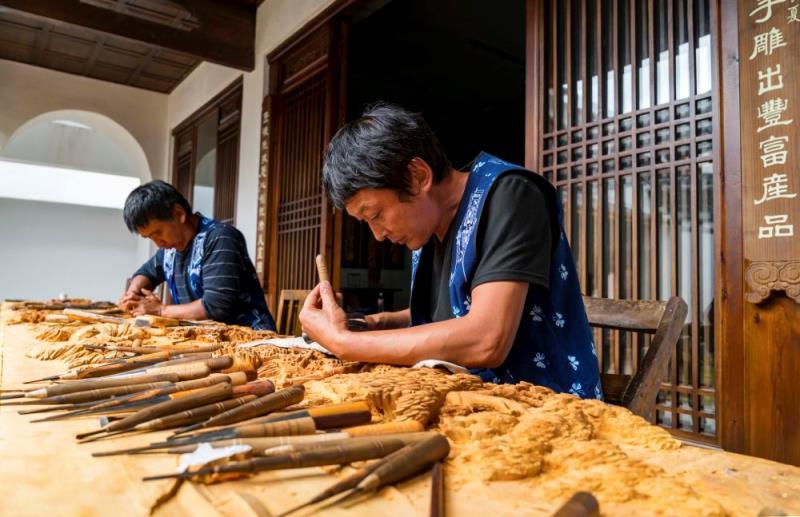 如今,经过1000多年的发展,剑川木雕已形成集嵌石木雕家具、工艺挂屏和座屏系列、古建筑、室内装饰装修、旅游工艺品小件、现代家具六大类260多个花色,其产品远销120多个国家和地区。目前,剑川全县从事木雕工艺人员有21000多人,木雕产业也已成为群众增收致富的“钱袋子”。