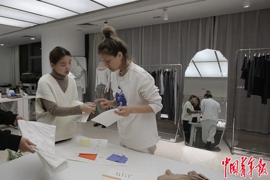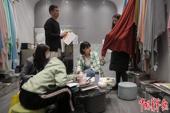 4月12日,浙江省绍兴市柯桥区一家写字楼内,30岁的服装设计师潘卓颖(左二)正在挑选设计公司工作人员带来的面料。