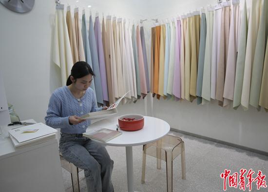 4月11日,浙江省绍兴市柯桥区,中国轻纺城东市场交易区的一家面料店里,21岁的邓彩晴在看色卡。她是湖南衡东人,今年刚刚进入面料行业从事销售工作。