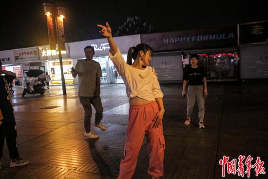 4月12日晚,浙江省绍兴市柯桥区,中国轻纺城国际面料采购中心附近的一条商业街,优美(中)正在领舞。她今年刚刚拥有一家自己的面料店,每天下班后都会来这里跳舞。