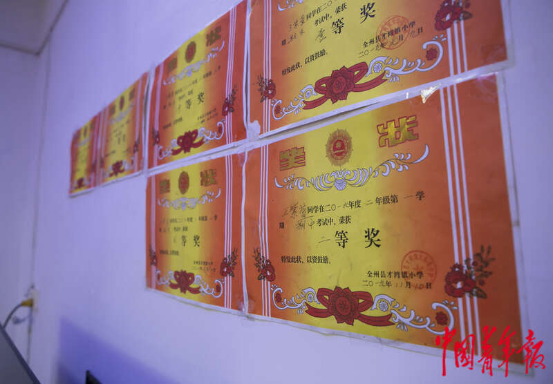 4月26日,广西桂林全州县才湾镇毛竹山村,罗玲玲家中的墙上贴着女儿的奖状。她的两个女儿一个上小学五年级,一个上三年级,学习成绩都很优异。总书记在与罗玲玲家人交谈中,特意提到教育的重要性,让孩子好好学习,这让罗玲玲印象深刻。她想让自己的两个女儿继续读书深造,把她们培养成对社会有用的人。中青报·中青网记者 曲俊燕/摄