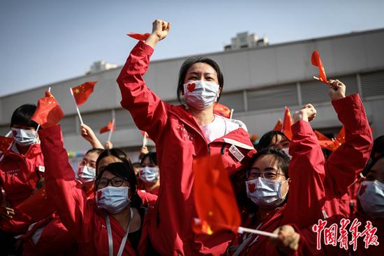 2020年4月9日,武汉市雷神山医院,最后一批援鄂医疗队集中撤离仪式上,挥舞国旗的青年医护人员。中青报·中青网记者 赵迪/摄