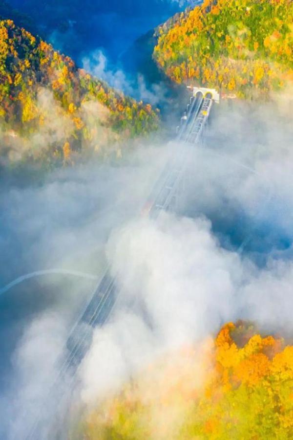 果子沟大桥上,汽车在峡谷间巡回漫游,既有怪石嵯峨、峭壁悬空的险境,又有开满杏花的茂密山林,犹如行走在天上云间,恍入童话仙境。