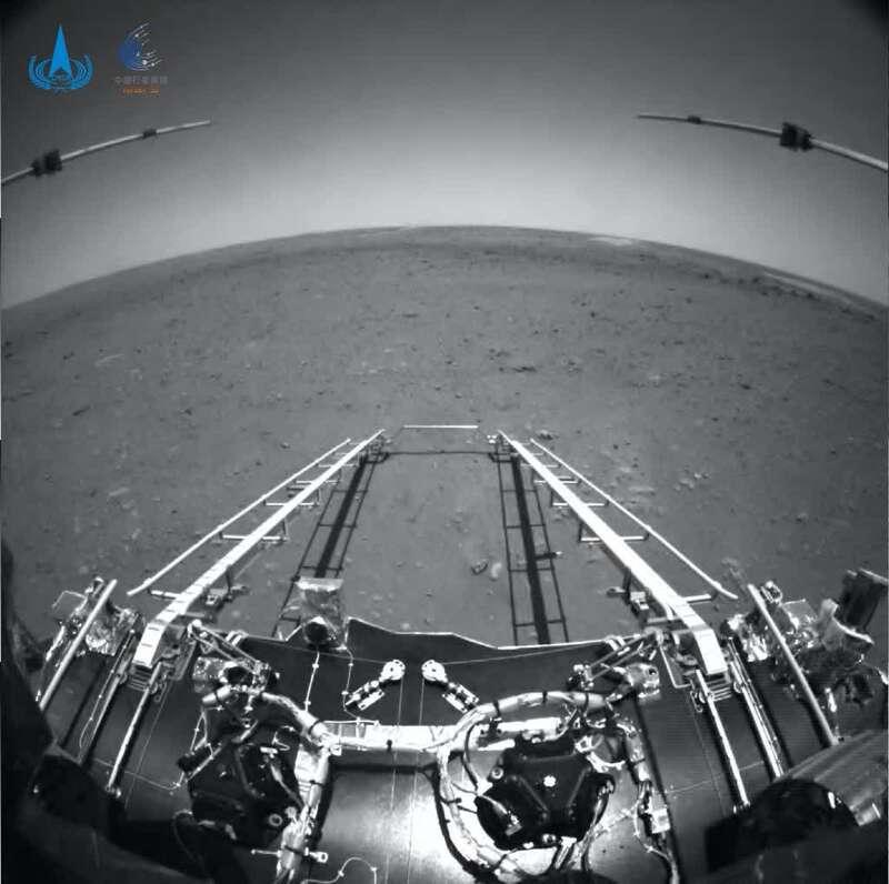 中国青年报客户端讯(中青报·中青网记者 邱晨辉)2021年5月19日,国家航天局发布我国首次火星探测天问一号任务探测器着陆过程两器分离和着陆后火星车拍摄的影像。图像中,着陆平台和“祝融号”火星车的驶离坡道、太阳翼、天线等机构展开正常到位。