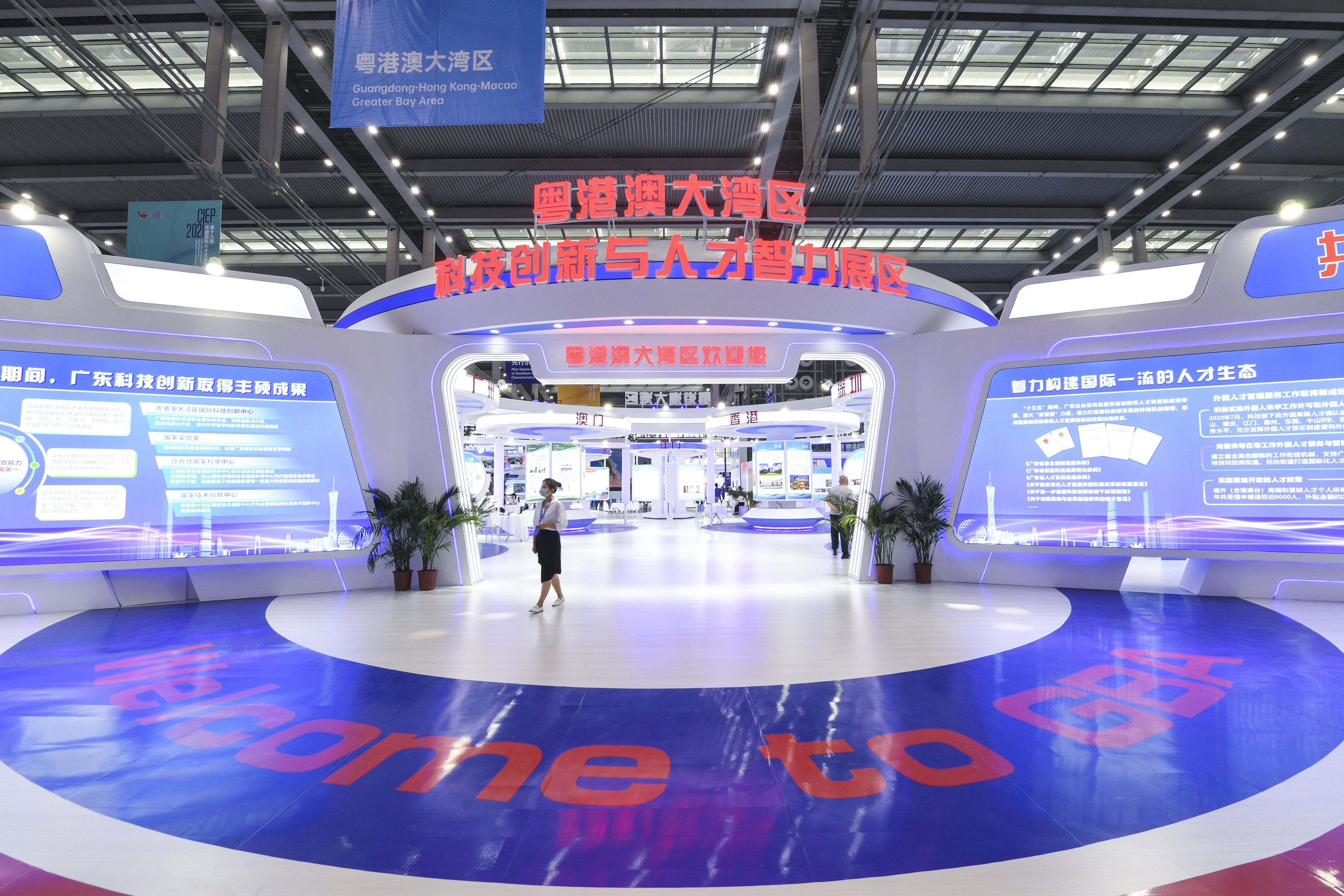 4月24日,与会者走过中国国际人才交流大会设立的粤港澳大湾区科技创新与人才智力展区。(新华社记者毛思倩摄)