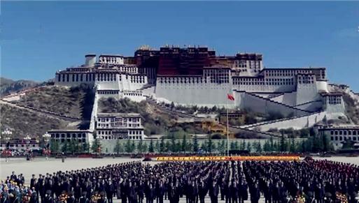 上午,鲜艳的五星红旗在布达拉宫广场上空迎风飘扬,各族各界代表首先奏唱了《中华人民共和国国歌》,随后,全场肃立,向为西藏和平解放英勇牺牲的革命先烈默哀。