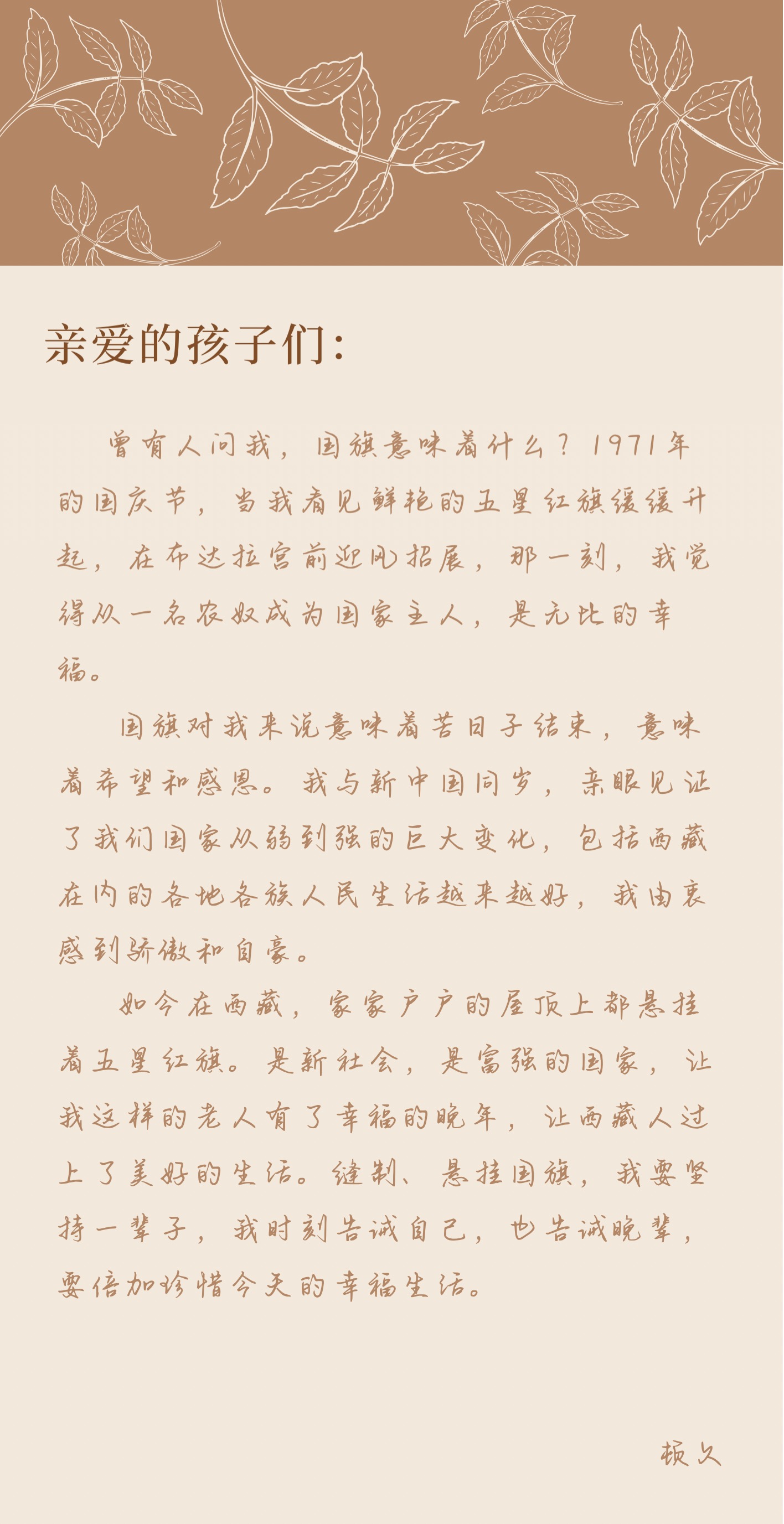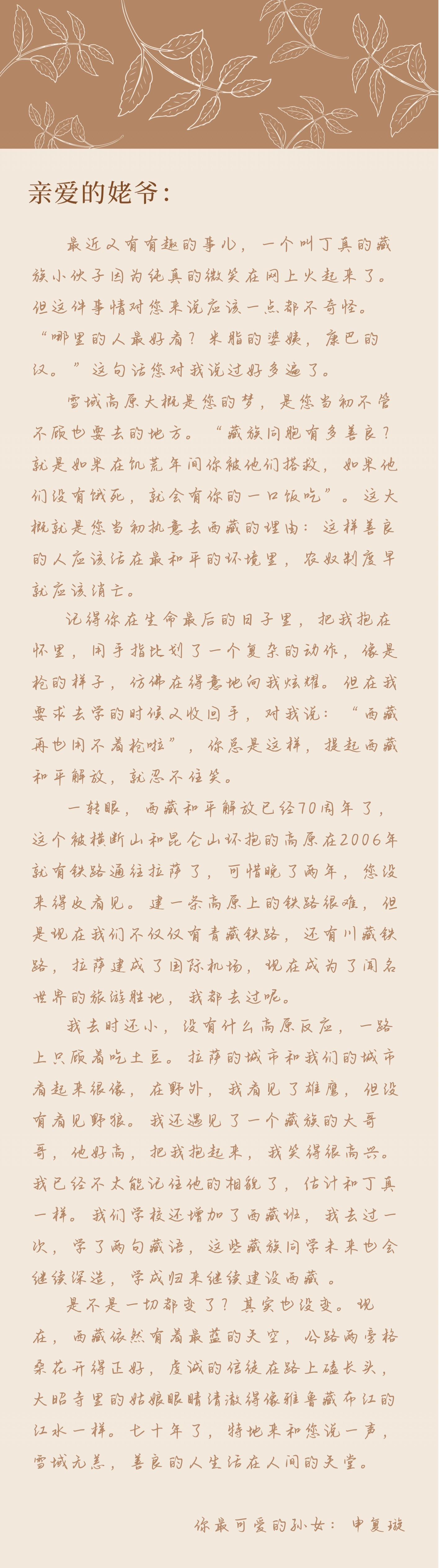 他那时很年轻,在路上遇到了很多善良纯朴的西藏人,他一直记得被当地人民热情地邀请进家里,藏族同胞家中的小女儿甜美又腼腆的笑容,还有当地会汉语的藏族同胞提起对生命的敬畏时那种清澈的眼神。旧西藏处于政教合一的封建农奴制统治之下,这种制度政教合一,神权至上。农奴身上的伤痕、破败的家……都让他气愤不已、难以忘怀。“封建农奴制黑暗落后,必然退出历史舞台。西藏人,这样和平的人,应该过最和平的日子。”是他常常告诉孙女的话。