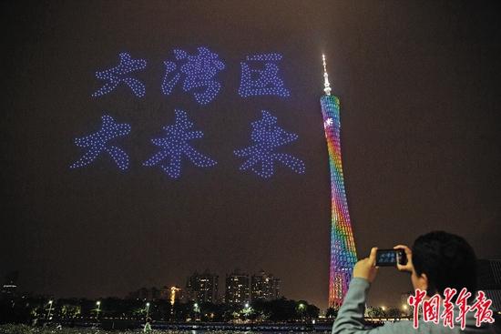 4月19日晚,广东省广州市,1000架无人机在夜空中进行天幕光影秀,用科技的方式讲述粤港澳的故事。其中一个环节,无人机在空中拼出闪光的“大湾区 大未来”字样。中青报·中青网记者 李峥苨/摄