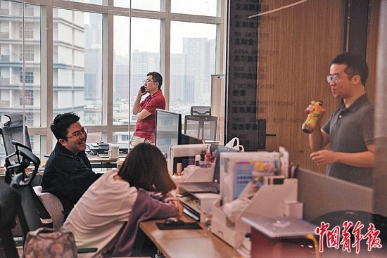 4月20日,广州市天河区港澳青年之家,金刚迷你仓的联合创始人之一、来自香港的青年创业者古伟龙(后排中)在办公室窗前打电话,窗外是广州的街景。港澳青年之家旨在为港澳青年在广州创业发展提供帮助,成立3年内,天河区港澳青年之家共服务8000多名港澳青年,同时成功孵化了180多家港澳青年企业在大湾区创业落户。中青报·中青网记者 李峥苨/摄