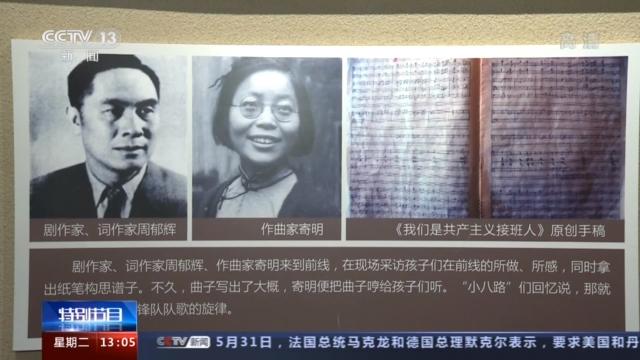 “英雄小八路”成员 何亚朱: (寄明)她是作曲家,马上就把那曲子谱出来,哼给我们听,听到她(寄明)给我们哼这个节奏,我们就觉得这个歌很好。