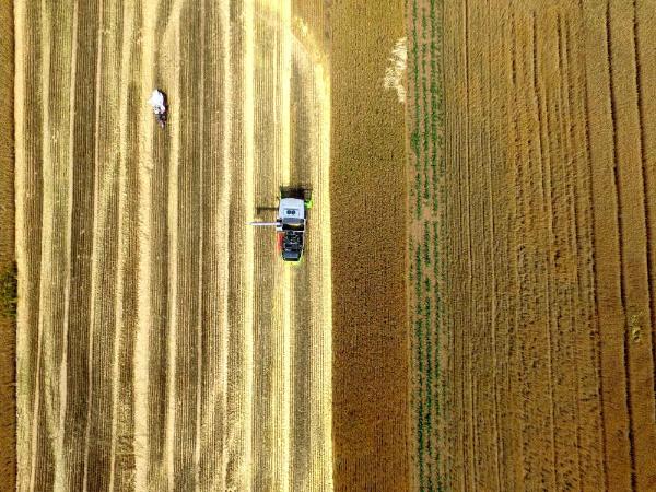 6月1日,收割机在山东省临沂市郯城县郯城街道三井村田间收割小麦(无人机照片)。新华社发(张春雷 摄)