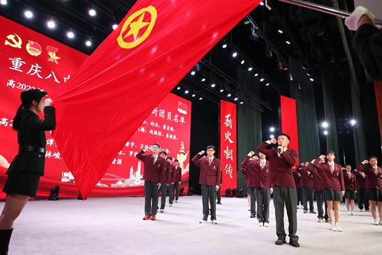 在重庆市酉阳县赵世炎烈士纪念馆塑像前,50名新团员接过团员证,戴上团徽,面向团旗,庄严宣誓。