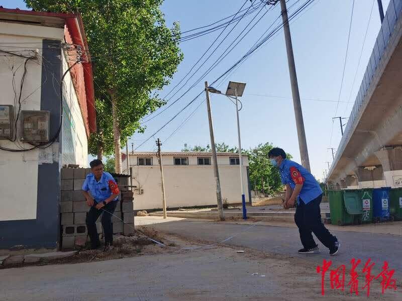 铁路巡线人员在测量一处彩钢房和旁边铁路高架桥的距离。中青报·中青网记者耿学清/摄