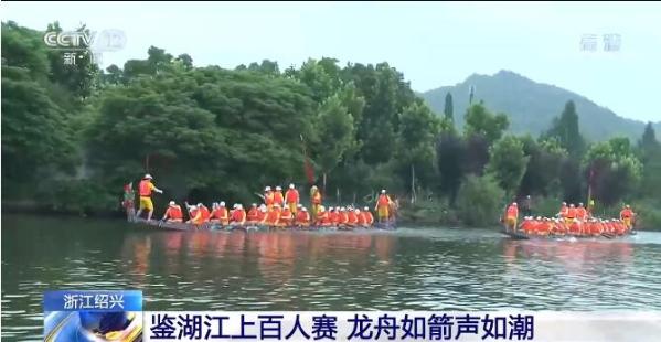 在浙江绍兴,风景秀丽的鉴湖江上百人龙舟赛火热进行。伴随着嘹亮的号子,龙舟如离弦之箭向终点疾驰而去。一时间,激水声、擂鼓声、呐喊声不绝于耳。选手们个个铆足了劲,平静的鉴湖江瞬间变成了热闹的海洋。