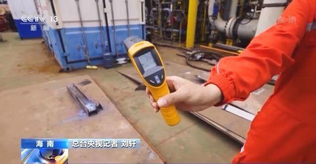 总台央视记者 刘轩: 在“深海一号”工作,这里炎热的天气也是一个考验。我们用这个温枪来测一下现在的温度,接近40℃。这里的工作人员告诉我,就在前几天,这里的温度能到50℃甚至更高。我穿着这么一身连体服,在外边待了十几分钟,就已经出了不少汗,身上也是汗流浃背了。而这里的工人每天要在这样的环境里工作至少八个小时。