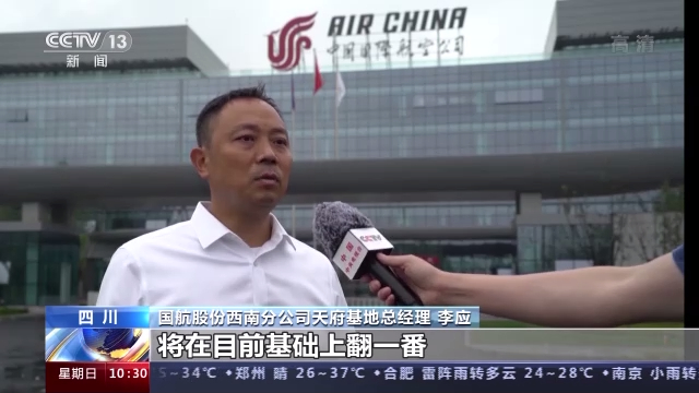 国航股份西南分公司天府基地总经理 李应: 从地理意义上看,成都是连接欧洲和东南亚、大洋洲的最佳枢纽航点选择。到2025年,国航在成都市场运力投放将在目前基础上翻一番,投入飞机超过160架,客货运输能力将大幅提升。