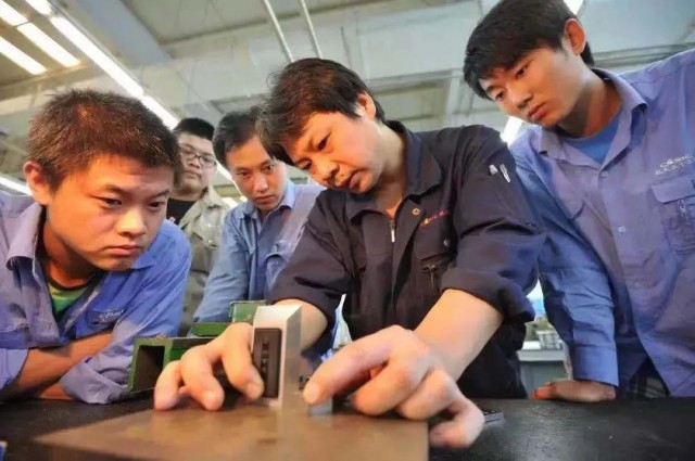 ▲大国工匠、中国航天科工三院33所巩鹏在车间与同事研究加工技术。