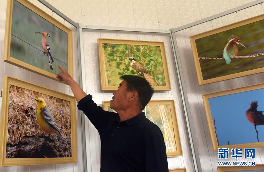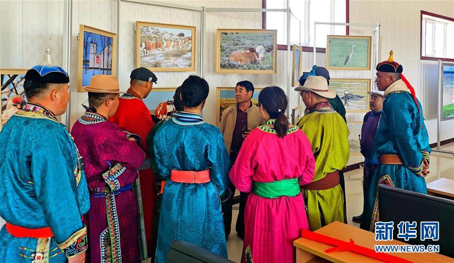 6月7日,廷·巴特尔介绍他在草场拍摄的野生鸟类照片。 新华社记者 恩浩 摄