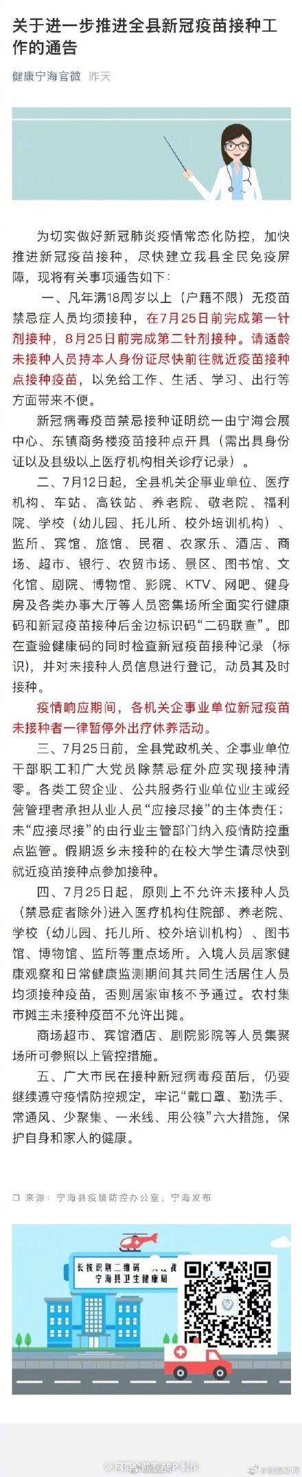 根据通知,7月25日前,宁海县党政机关、企事业单位干部职工和党员除有禁忌症外应实现接种清零。各类工贸企业、公共服务行业单位业主或经营管理者承担从业人员“应接尽接”的主体责任,未“应接尽接”的由行业主管部门纳入防控重点监管。
