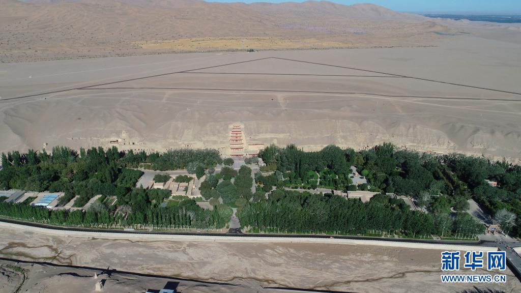 大泉河及其流经的敦煌莫高窟(7月6日摄,无人机照片)。新华社记者 刘诗平 摄