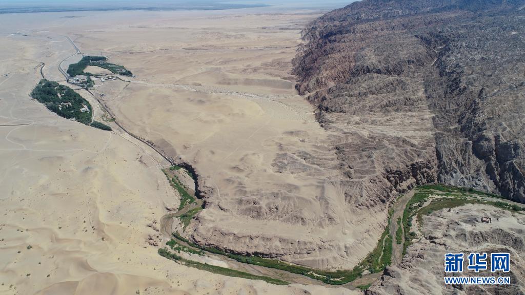 鸟瞰大泉河及其流经的敦煌莫高窟(7月6日摄,无人机照片)。新华社记者 刘诗平 摄