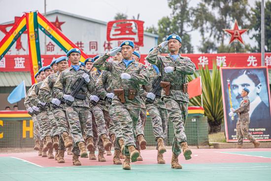 中国维和部队官兵迈着铿锵有力的步伐走过主席台。彭毅/摄