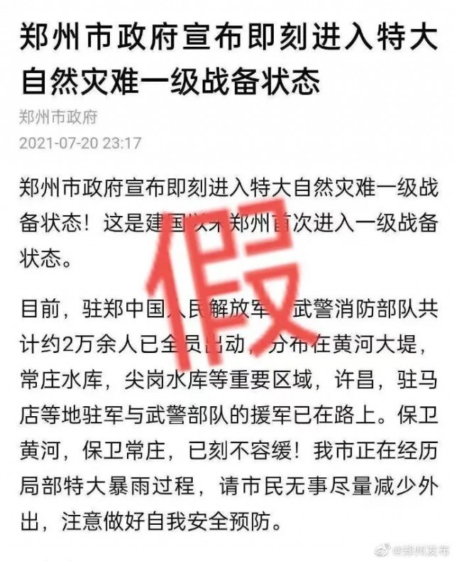 据郑州市委宣传部消息,7月20日,网传“郑州进入特大自然灾难一级战备状态”,经核实为不实消息。