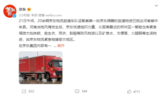 据“京东黑板报”消息,21日午间,20余辆京东物流救援车队运载着第一批京东捐赠的救援物资已抵达河南省中牟县。河南当地汛情发生后,京东快速组织力量,从距离最近的郑州亚一智能仓库紧急调拨大批铁锨、救生衣、雨衣、胶鞋等防汛物资以及矿泉水、方便面、火腿肠等生活物资,由京东物流紧急驰援受灾地区。