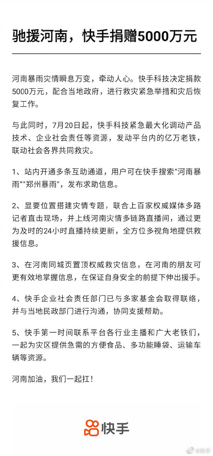 快手捐款5000万元,紧急驰援河南,配合当地政府,进行救灾紧急举措和灾后恢复工作。