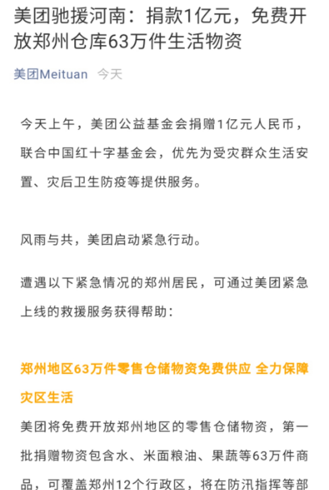美团捐款1亿元,免费开放郑州仓库63万件生活物资美团公益基金会捐赠1亿元人民币,联合中国红十字基金会,优先为受灾群众生活安置、灾后卫生防疫等提供服务。美团已将郑州区域内包括纯净水、米面粮油等63万件生活必需品全部捐赠至防汛指挥部门。此外,河南用户可以通过美团App、大众点评App等寻找使用紧急避难、紧急充电、志愿寻人等服务。 美团目前已成立河南暴雨援助专项小组,紧急协调多元社会力量,未来还将以公益捐款、物资驰援、组织志愿者等多种方式,配合有关部门参与灾情救援。