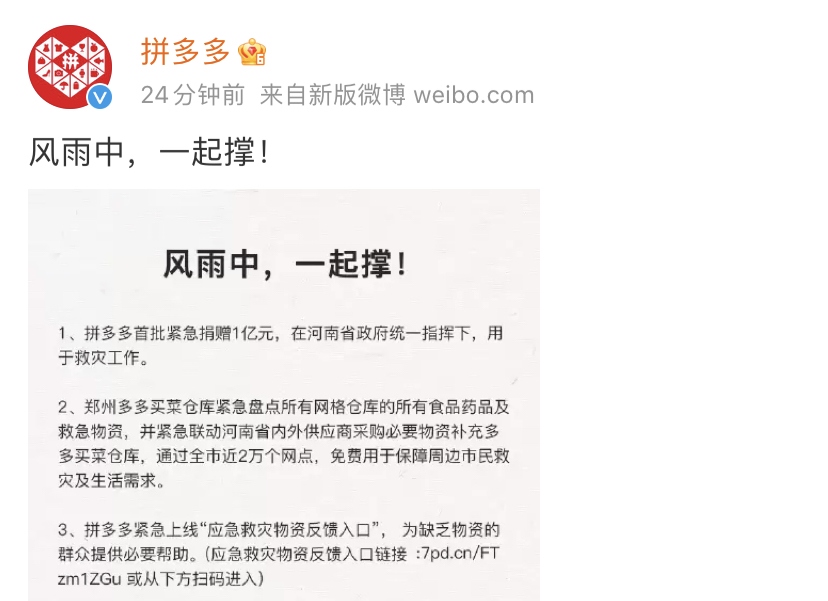 目前,拼多多已设置业务专员对接群众受灾需求,并及时做出响应。