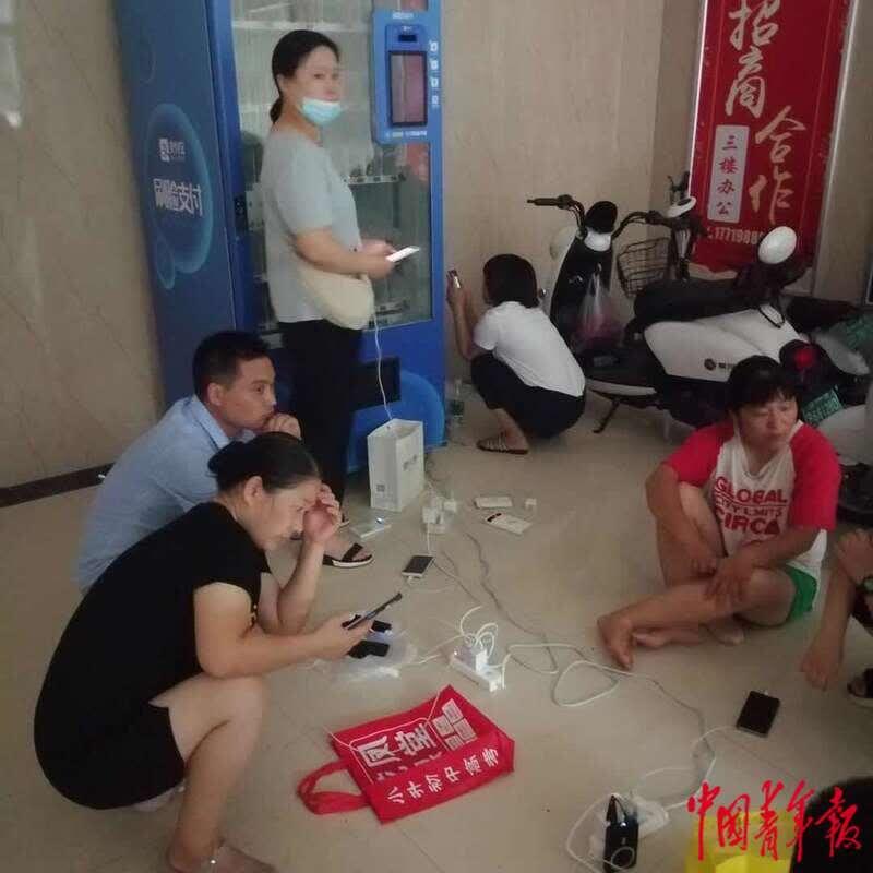 7月21日下午,大批市民聚集在郑州市北三环“宝欧商务”一楼。他们大多是附近小区居民,到此处给手机等电子产品充电。