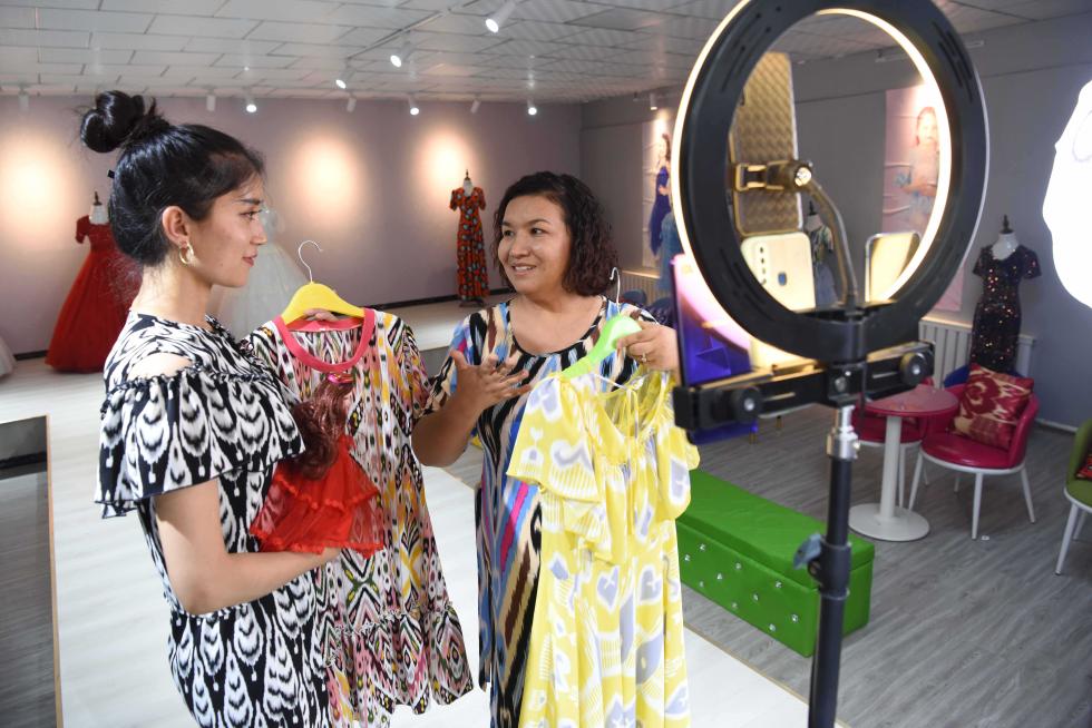 在新疆伽师县的祖美尔服装有限公司,公司负责人排丽旦·吐地(右)和员工讨论网络直播带货细节(7月11日摄)。2020年,排丽旦·吐地被广东援疆指挥部遴选为致富带头人,获得项目资金支持后,她改造展厅,增加实体店铺,并开展线上网店运营,带动150人就业。新华社记者 丁磊 摄