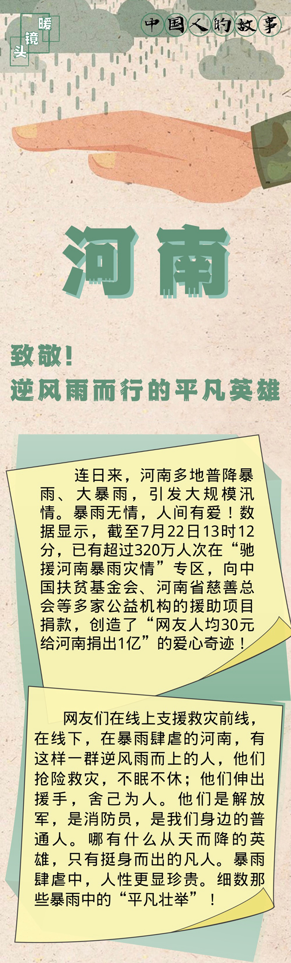 连日来,河南多地普降暴雨、大暴雨,引发大规模汛情。暴雨无情,人间有爱!数据显示,截至7月22日13时12分,已有超过320万人次在“驰援河南暴雨灾情”专区,向中国扶贫基金会、河南省慈善总会等多家公益机构的援助项目捐款,创造了“网友人均30元给河南捐出1亿”的爱心奇迹!
