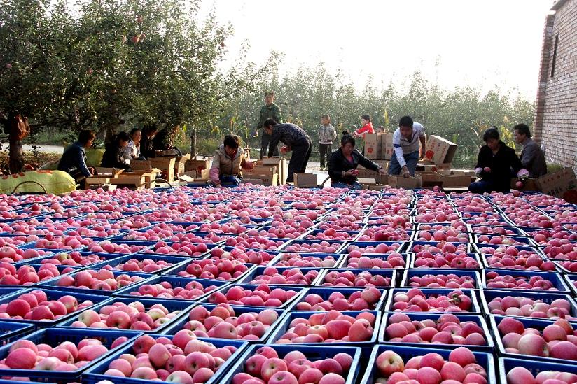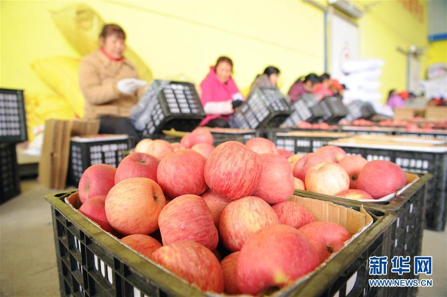 资料图:在延安市黄陵县隆坊镇上官村,工作人员在分拣苹果。新华社发(张博文摄)